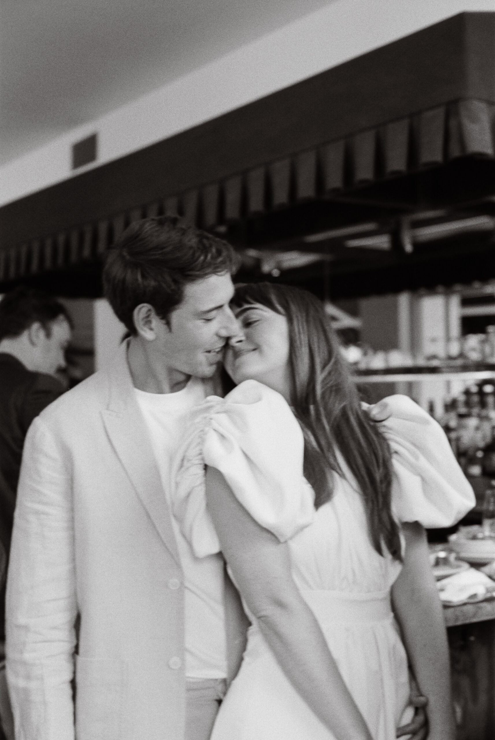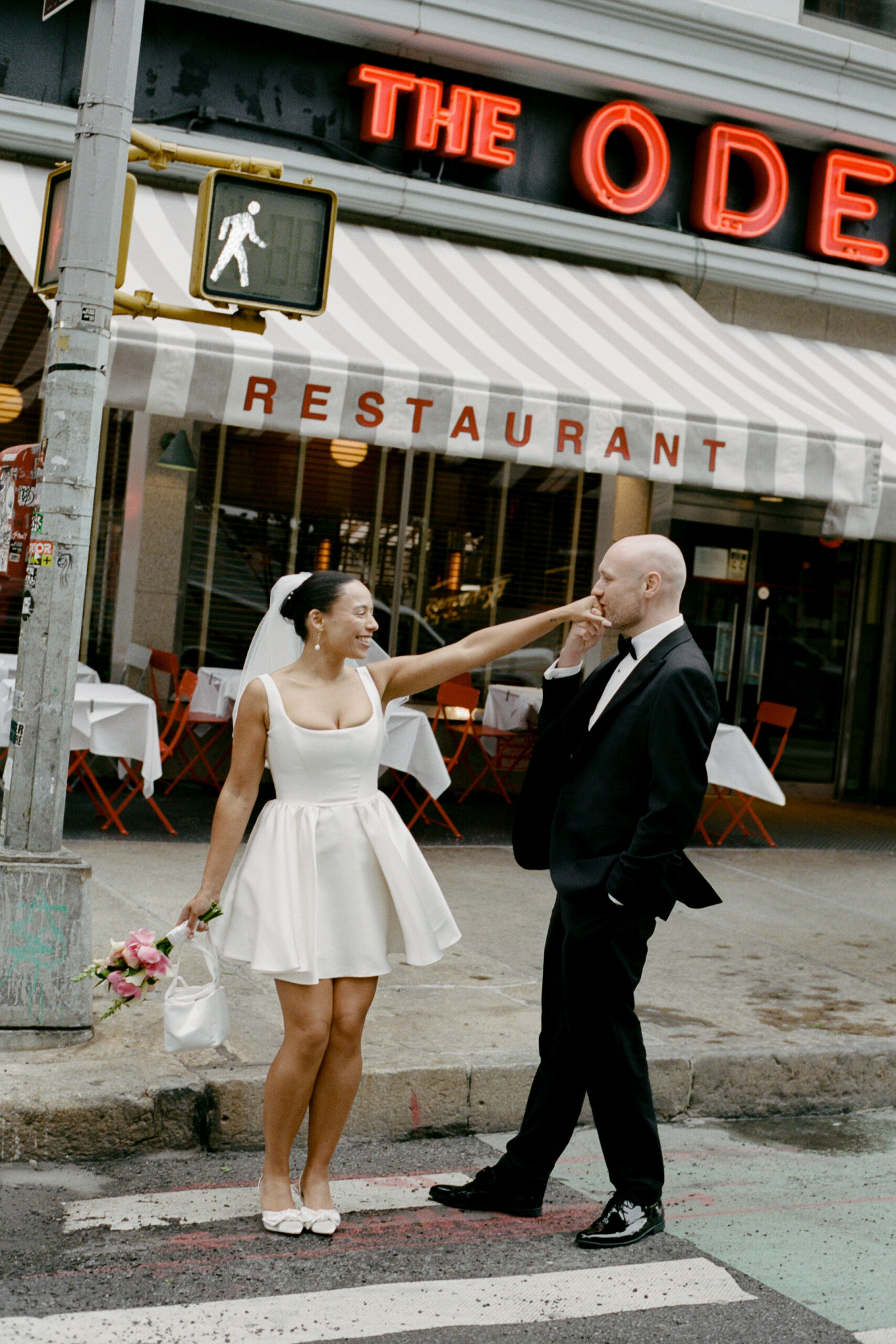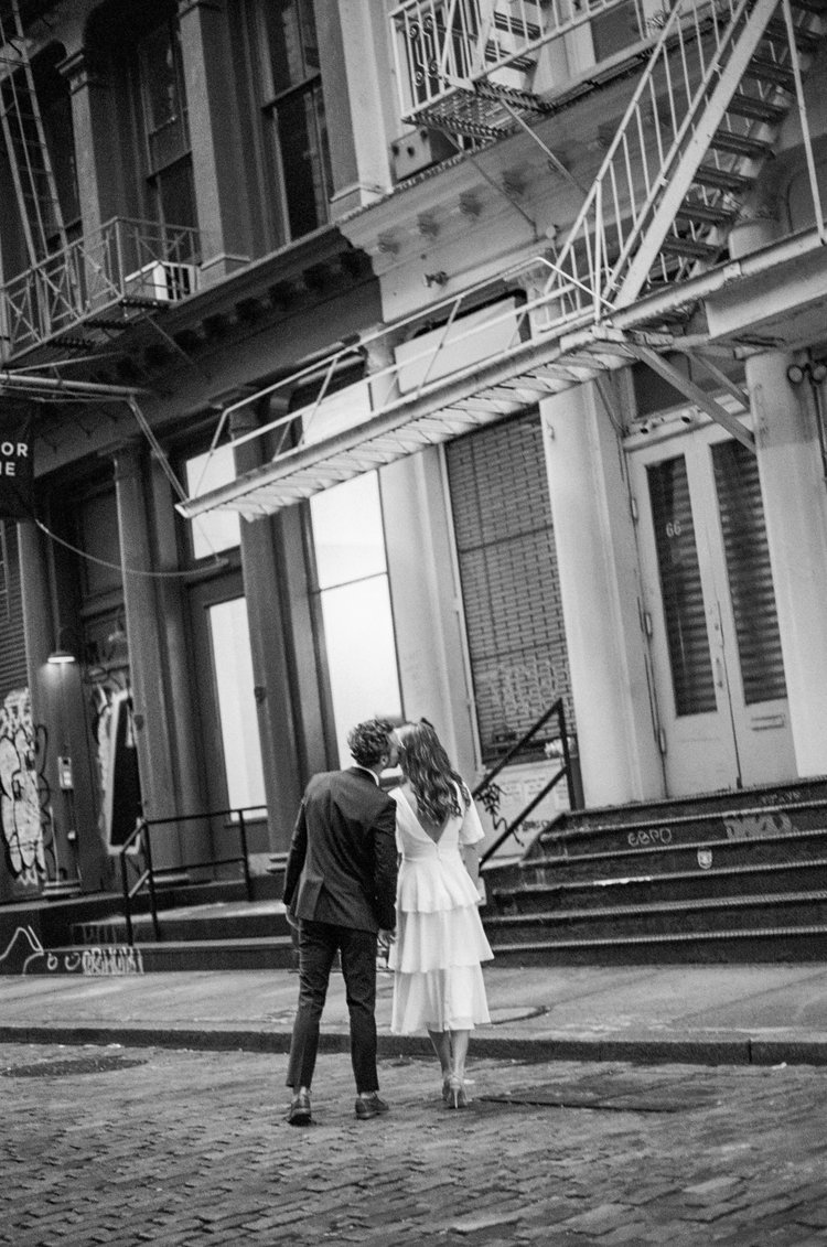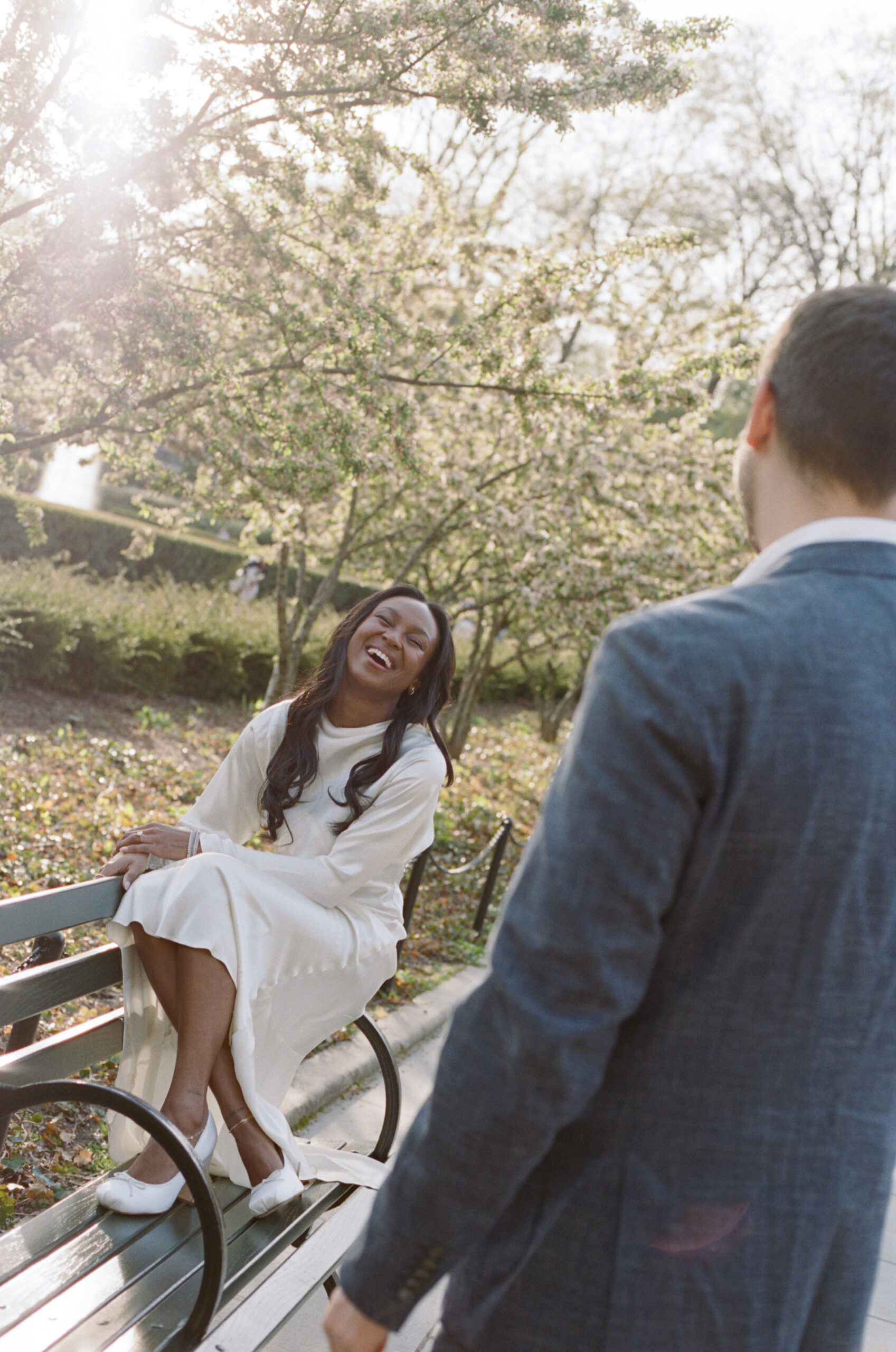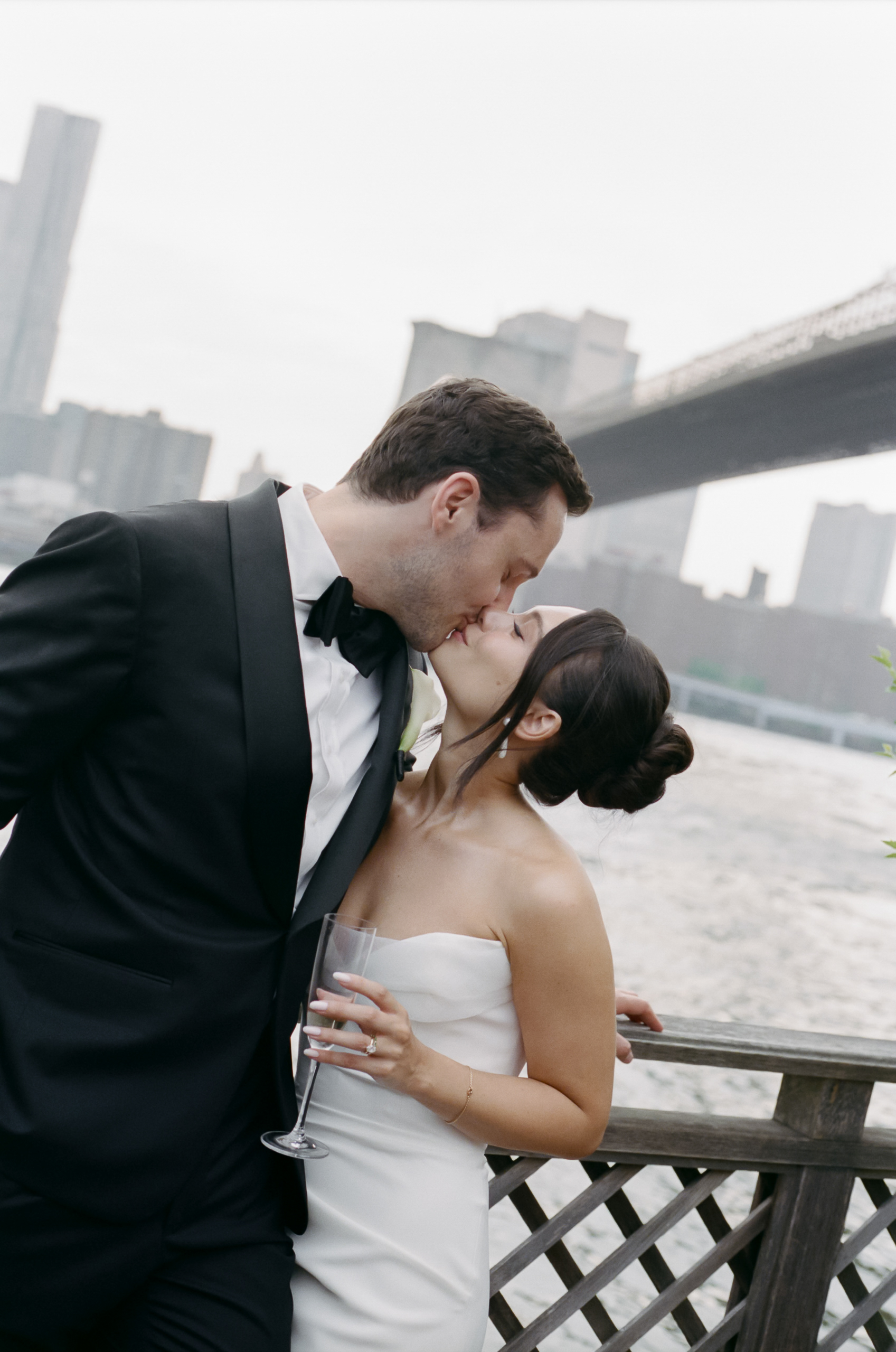 engagement photo on the brooklyn bridge shot on film by parkers pictures Elopement at the Metropolitan Museum of Art taken by Parkers Pictures Nine Orchard Engagement NYC taken by Parkers Pictures Couple laughing at Le Dive NYC taken by Parkers Pictures