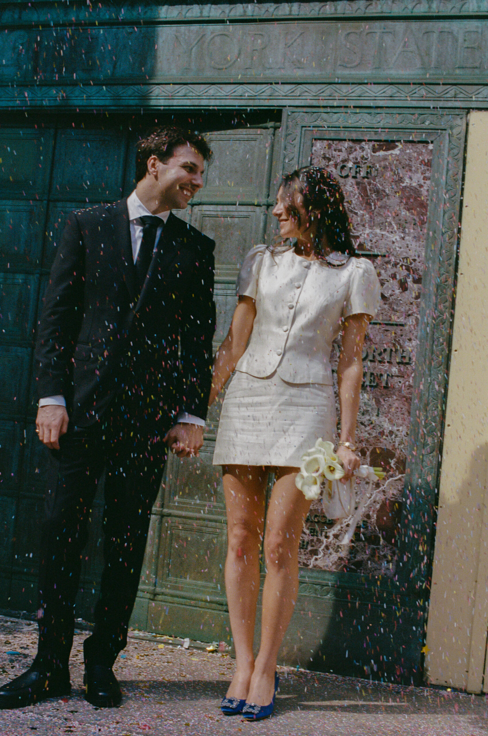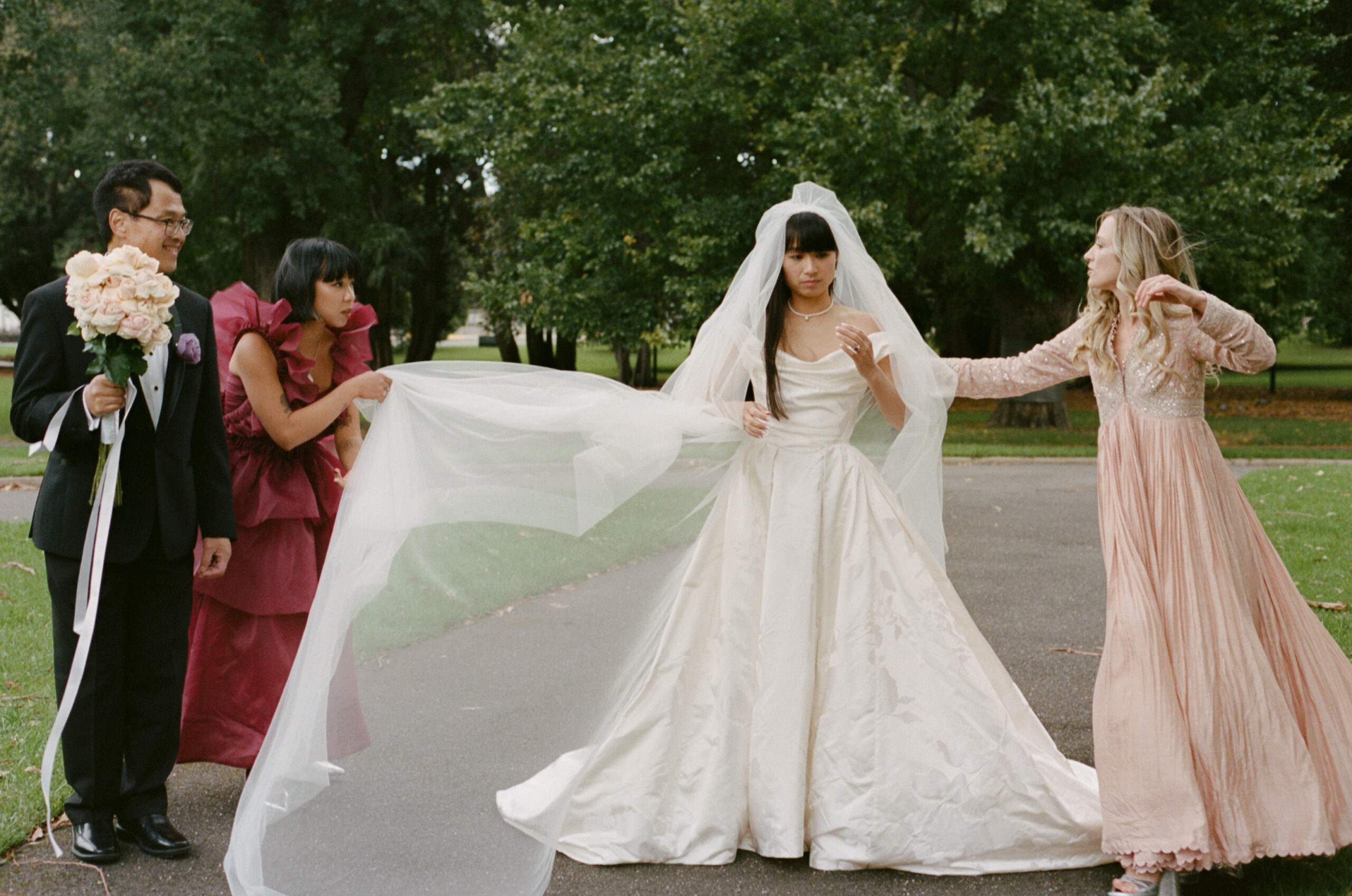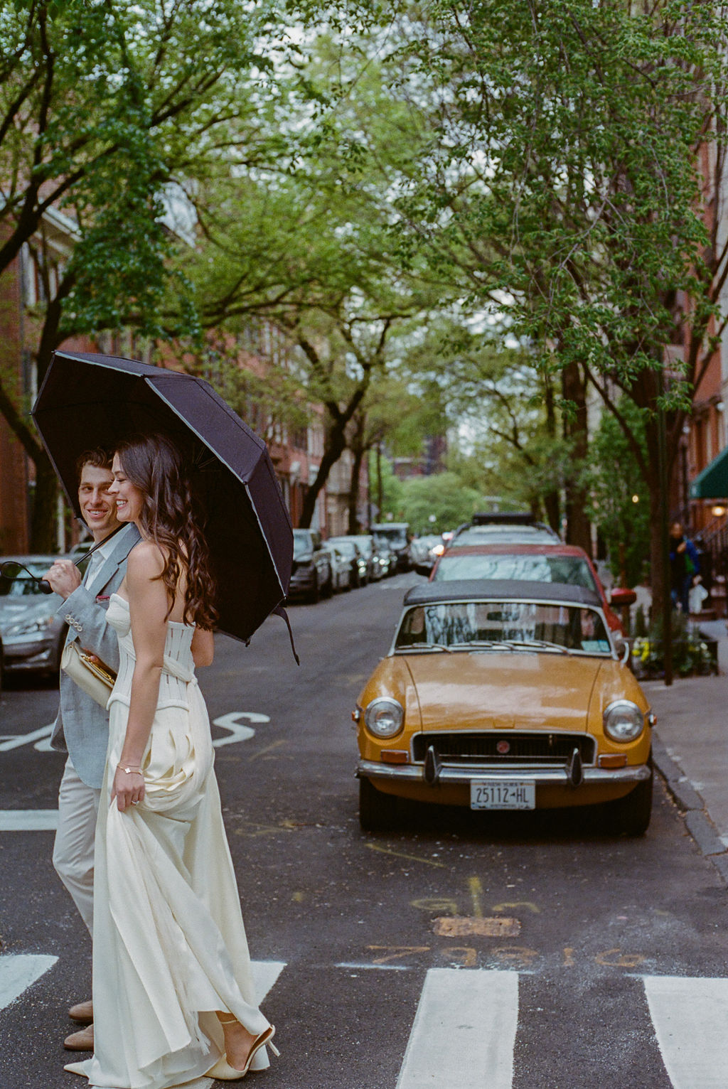 couple in the back of a nyc taxi shot on film by parkers pictures flower girls during ceremony shot on film by parkers pictures