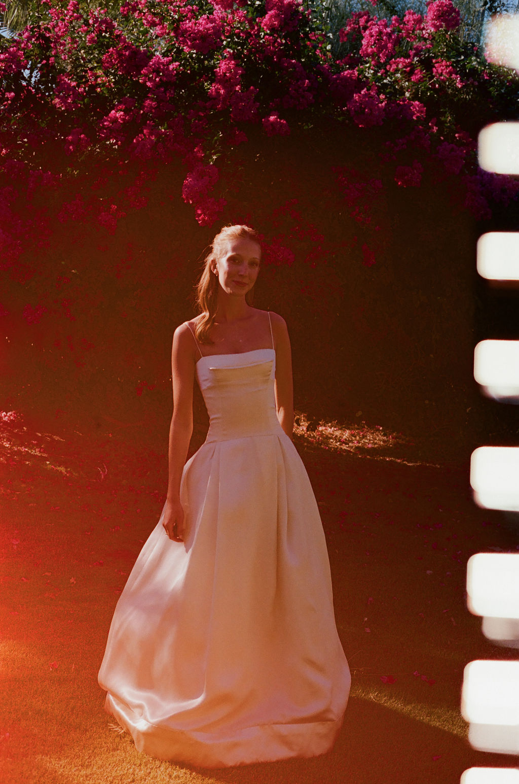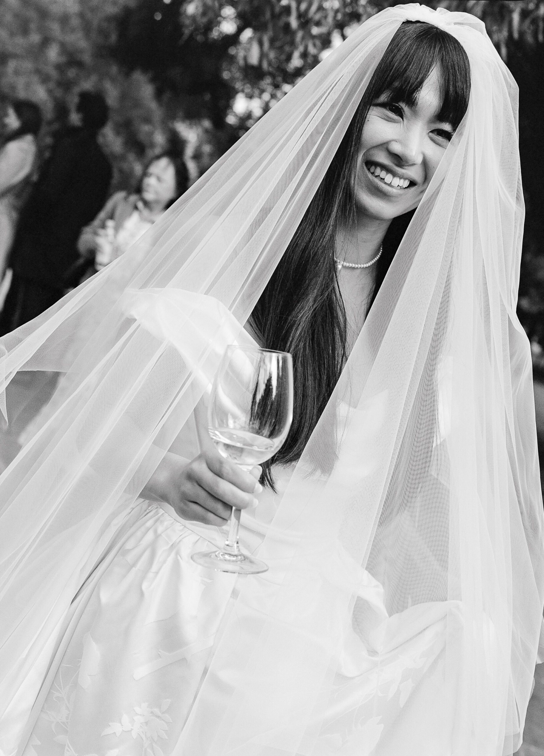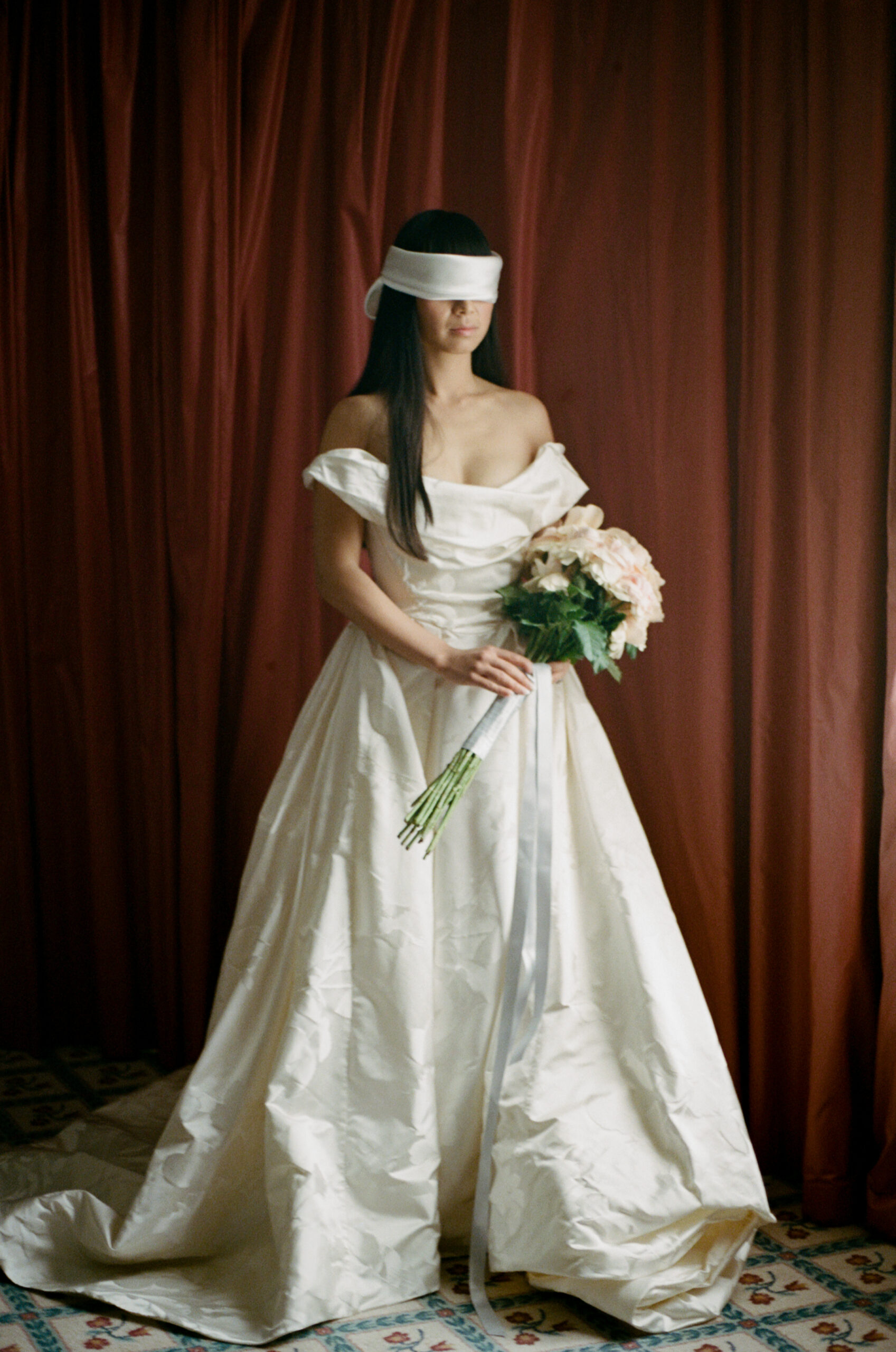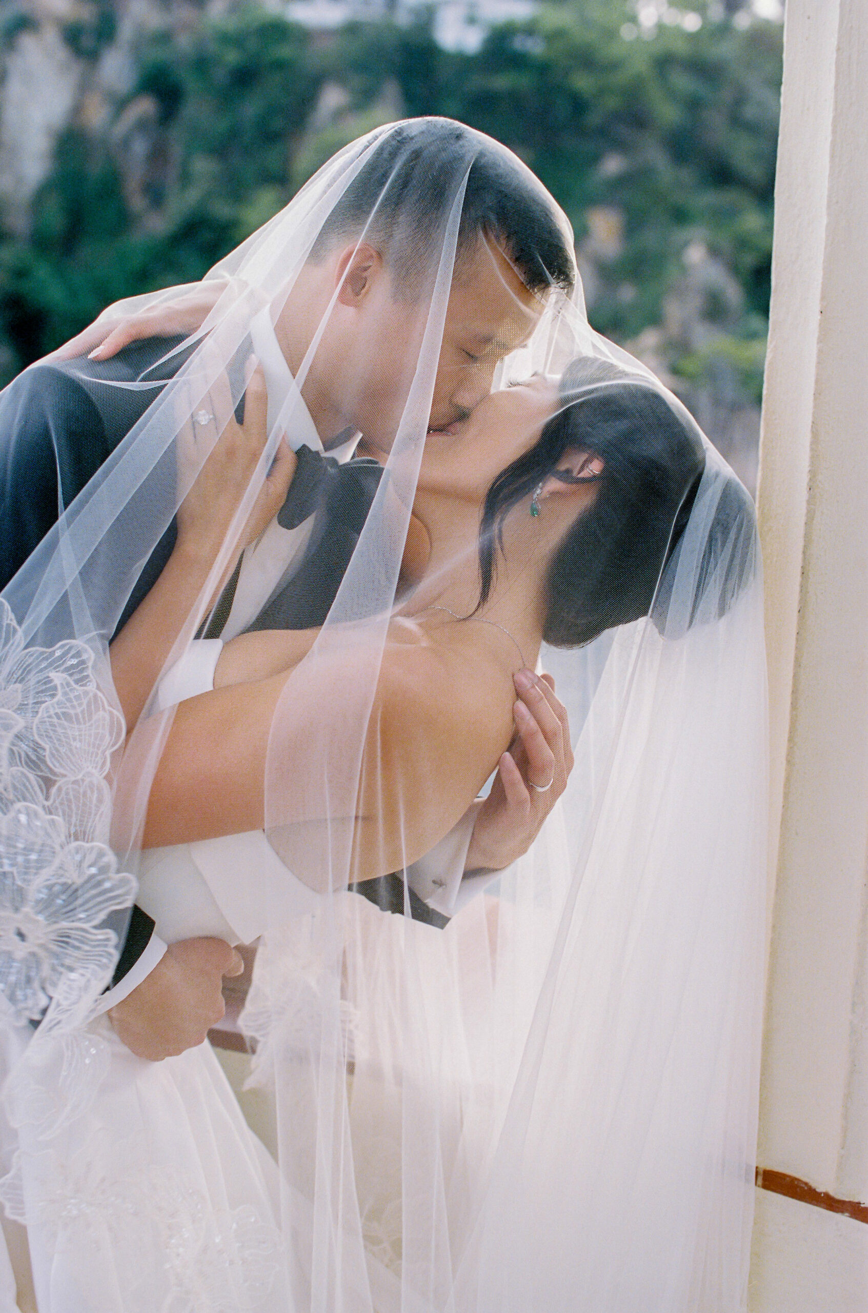 green floral arrangement in front of brides face emilia wickstead wedding dress shot on film by parkers pictures man against flower wall in Lake Garda Italy shot on film by Parkers Pictures bride among flowers wedding on mount desert island maine shot on film by parkers pictures