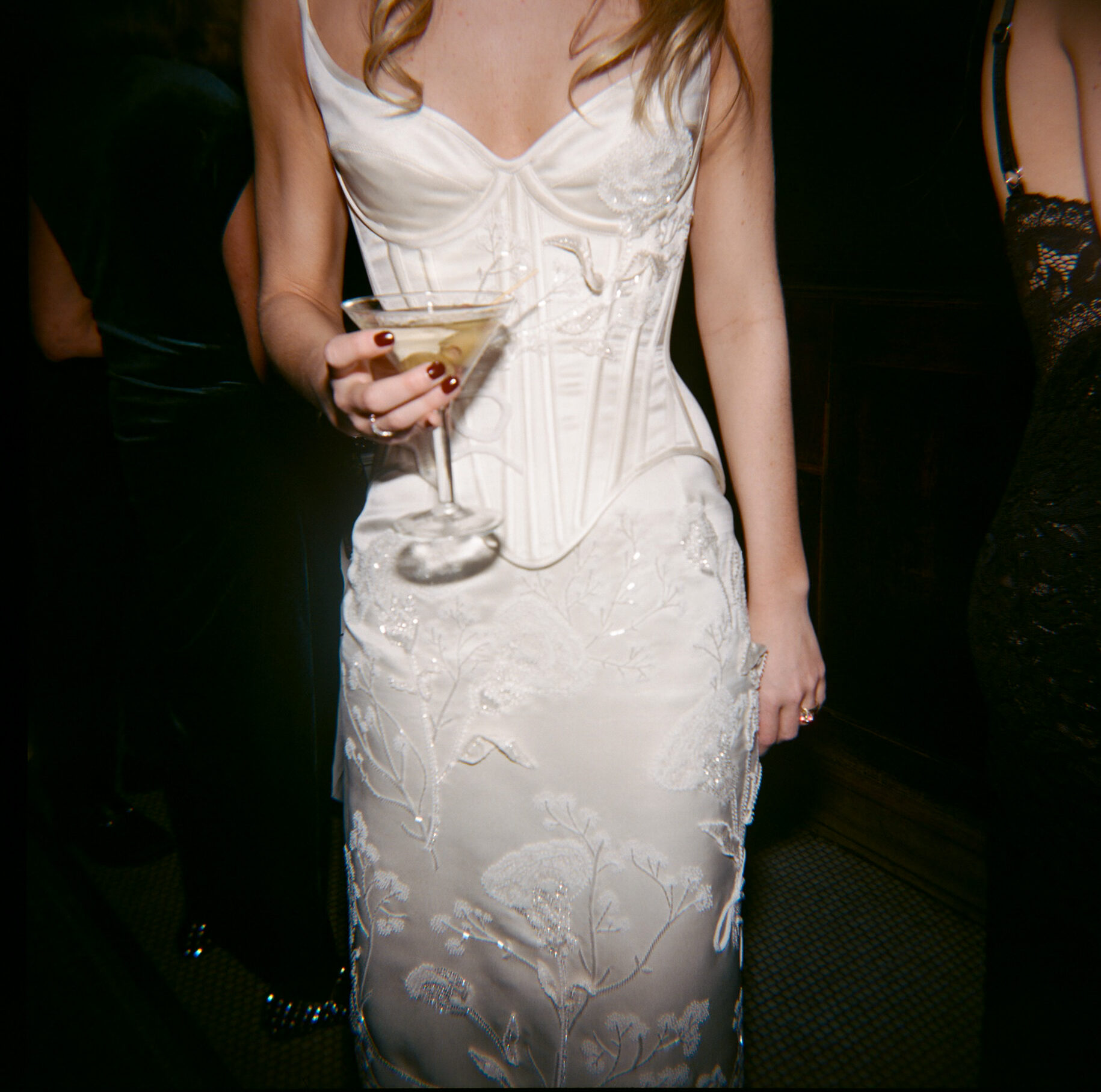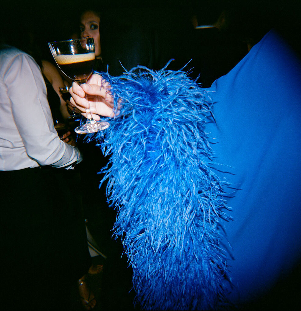 bowery hotel party hand holding martini glass against green velvet curtains shot on film by parkers pictures