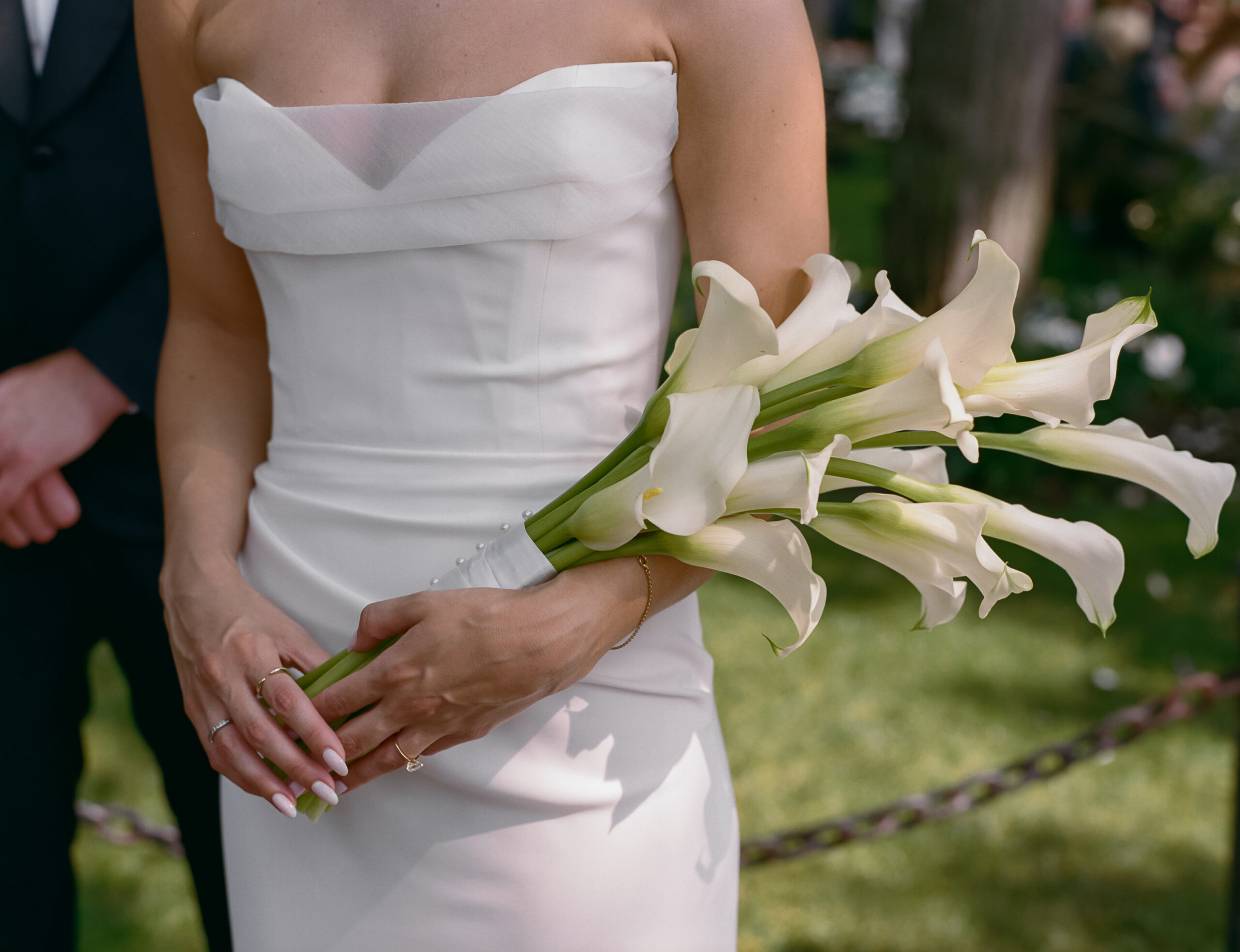 green floral arrangement in front of brides face emilia wickstead wedding dress shot on film by parkers pictures bride among flowers wedding on mount desert island maine shot on film by parkers pictures couple dancing at TWA Hotel NYC taken by Parkers Pictures