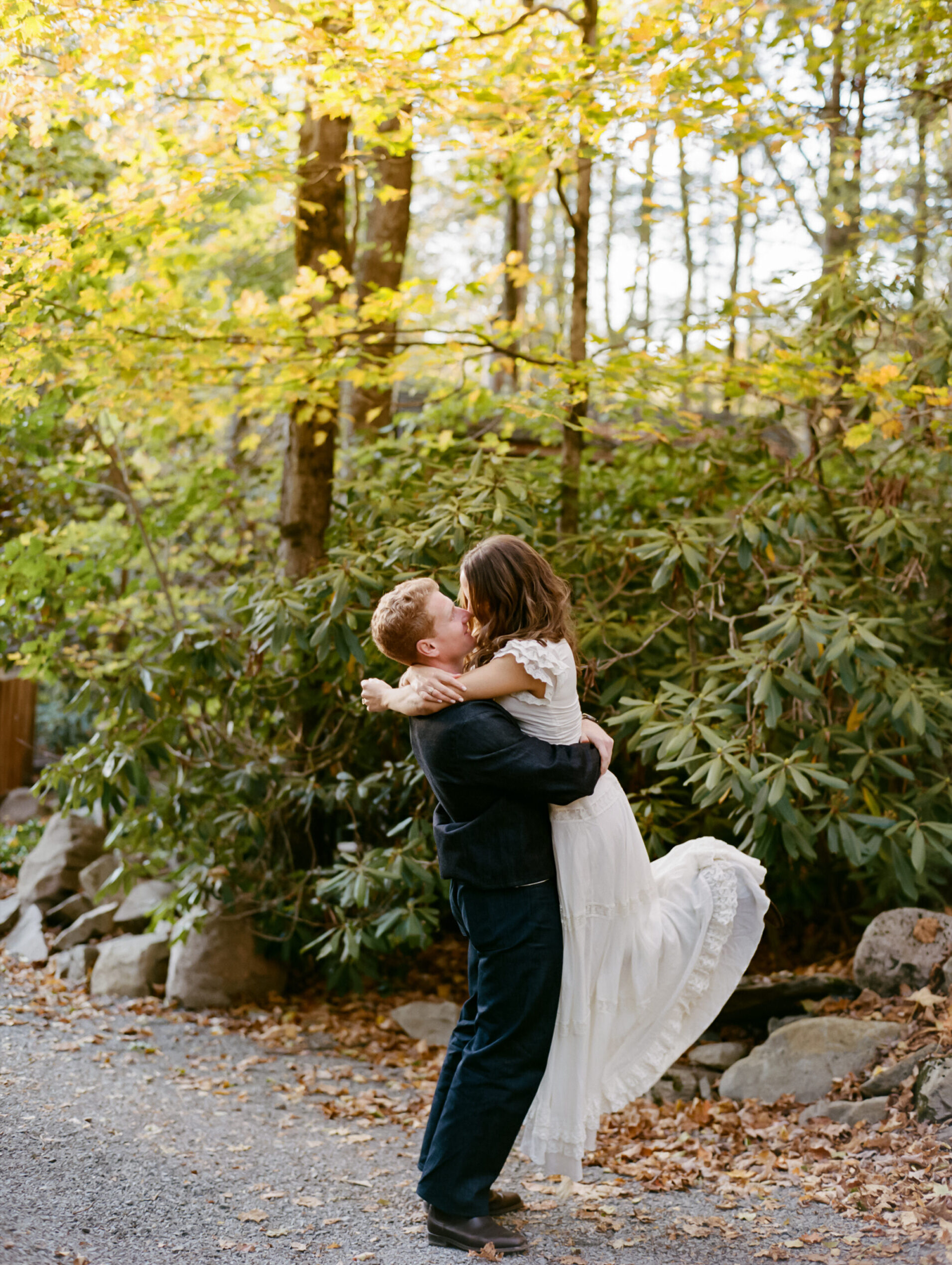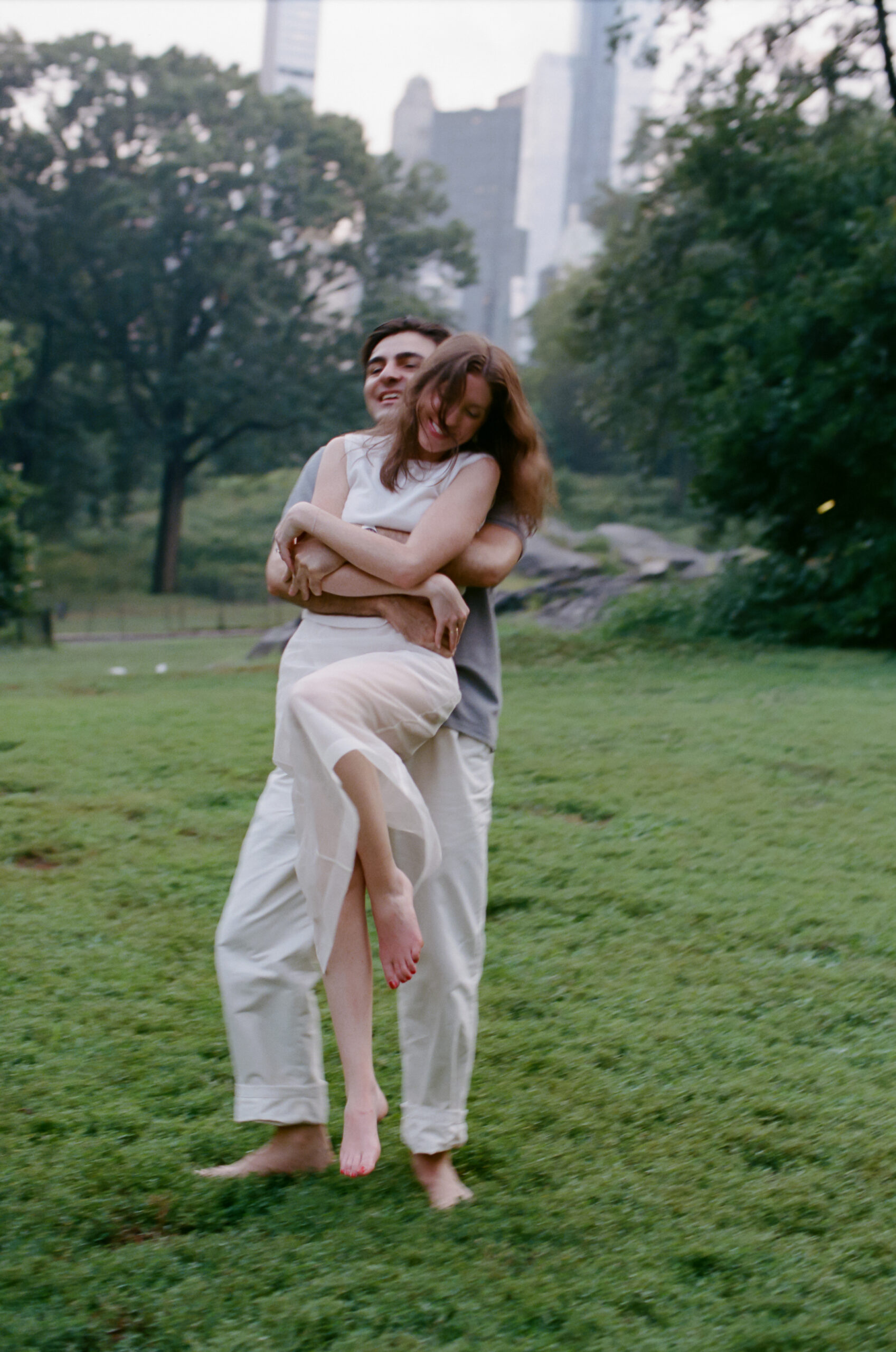 couple embracing in brooklyn bridge park engagement photo at the river cafe shot on film by parkers pictures