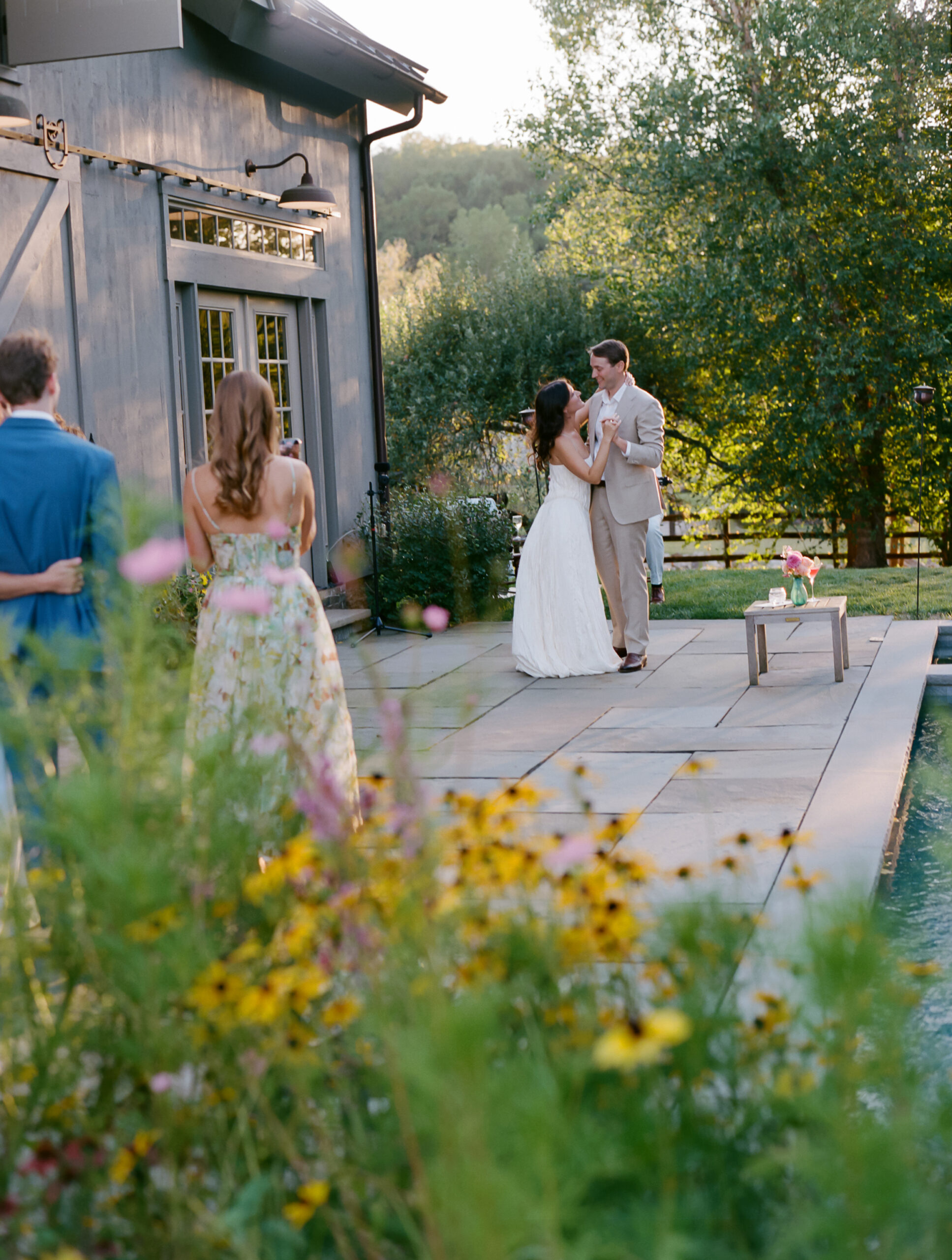 Mount Desert Island Maine wedding portrait shot on film taken by Parkers Pictures colorful whimsical arrangement against green wall shot on film by parkers pictures Green Emilia Wickstead Dress on the Dance Floor taken by Parkers Pictures